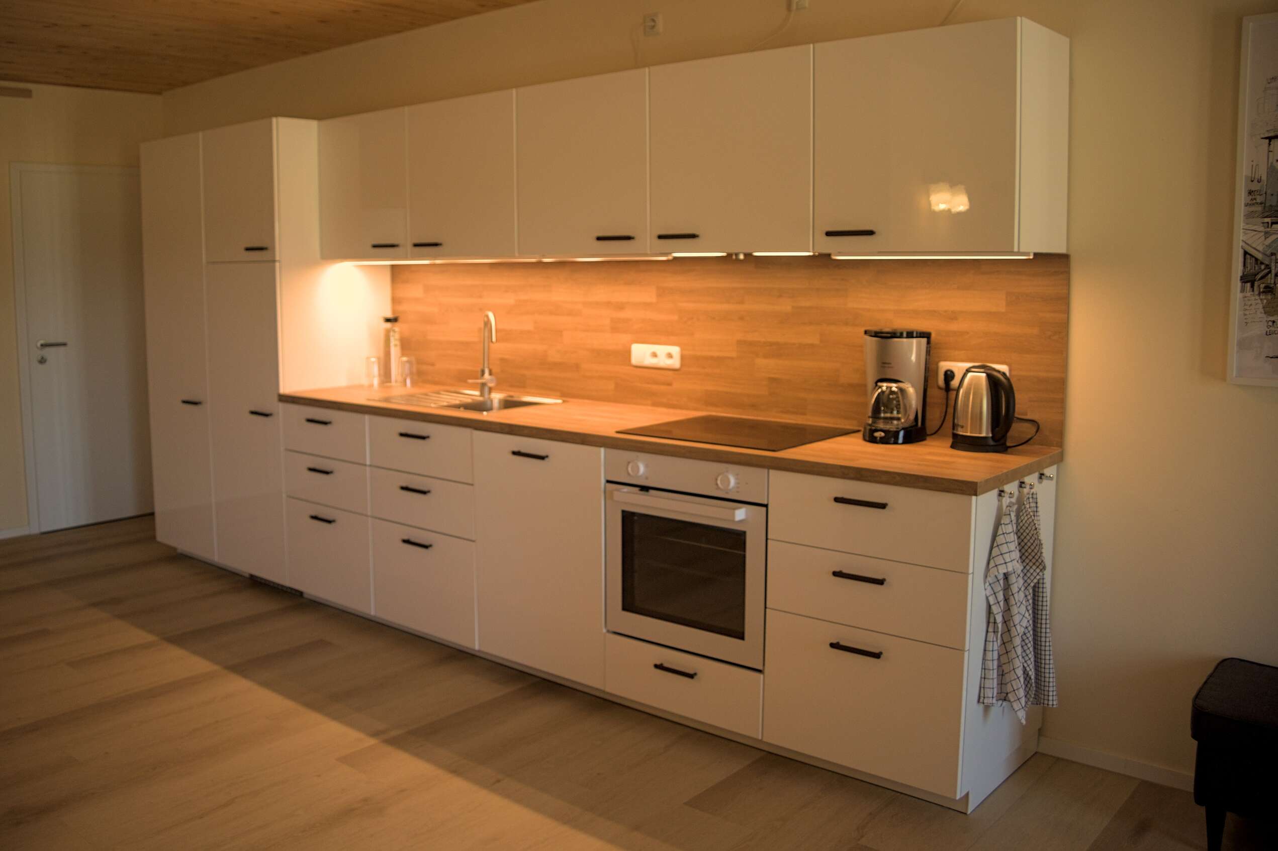 - voll ausgestattete Küche mit Induktionsherd, Backofen, Geschirrspüler, Mikrowelle, Wasserkocher, Kaffeemaschine und Toaster